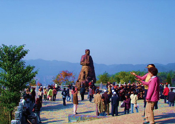 在茶盤塔的西南側,有壹座海拔1200多米高 的山峰,這就是“天子峰”。天子峰,看上去活象壹位偉人,他坐在那裏,身披鐵甲,右手握箭,濃眉隆起,兩眼怒視前方,似正要指揮千軍萬馬出征,大戰壹場。這個形象就是人們傳說的向王天子,所以取名叫“天子峰”。 |